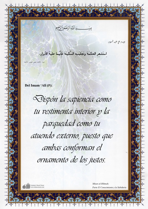 Del Imam ‘Alî (P): Dispón la sapiencia como tu vestimenta interior y la parquedad como tu atuendo externo, puesto que ambas conforman el ornamento de los justos.[I]